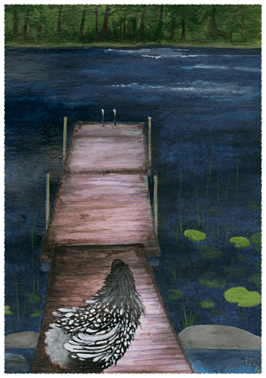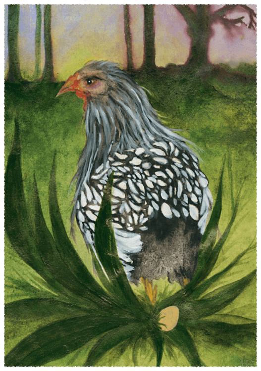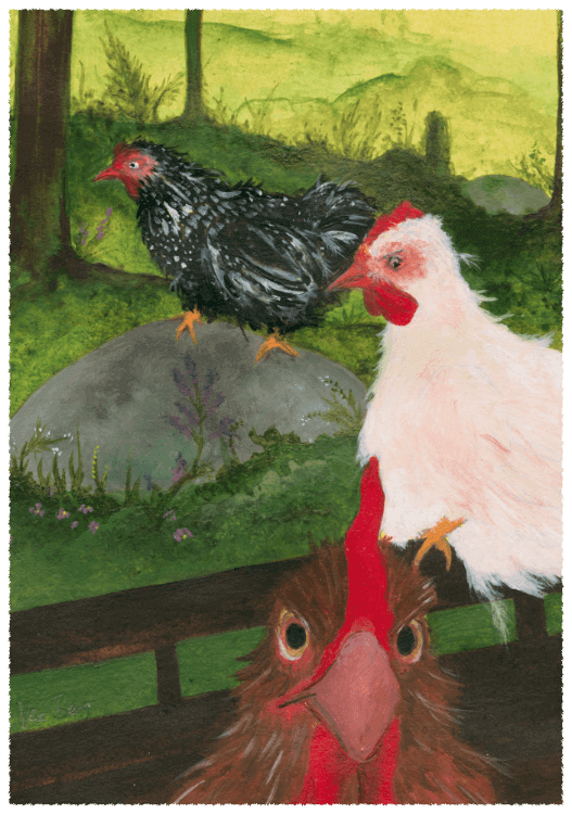 Um ihre Gäste zum Analogen zu animieren, bat sie mich um Postkartenmotive. Diese liegen nun in jedem ihrer drei Ferienhäuser zum Schreiben und Verschicken aus. Auf drei der Karten ist ein schwarz-weißes Huhn zu sehen. Es hieß Tulli und wurde sehr geliebt – wenn es gackerte war es, als würde eine alte Frau lachen. Im Stall oder im hohen Gras – bevor man Tulli sah, hörte man sie.